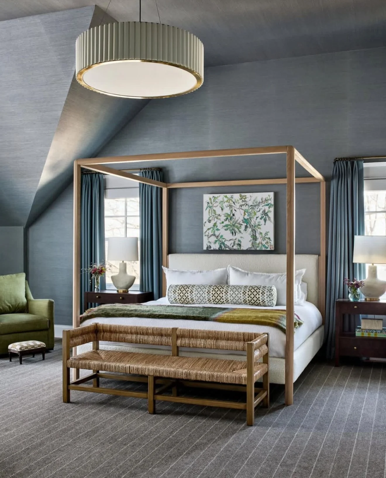 A bedroom with blue walls, a canopy bed with white bedding, a pillow and a blanket, a wooden bench at the foot of the bed, two windows with blue curtains, a green armchair, and two nightstands with lamps and flowers.