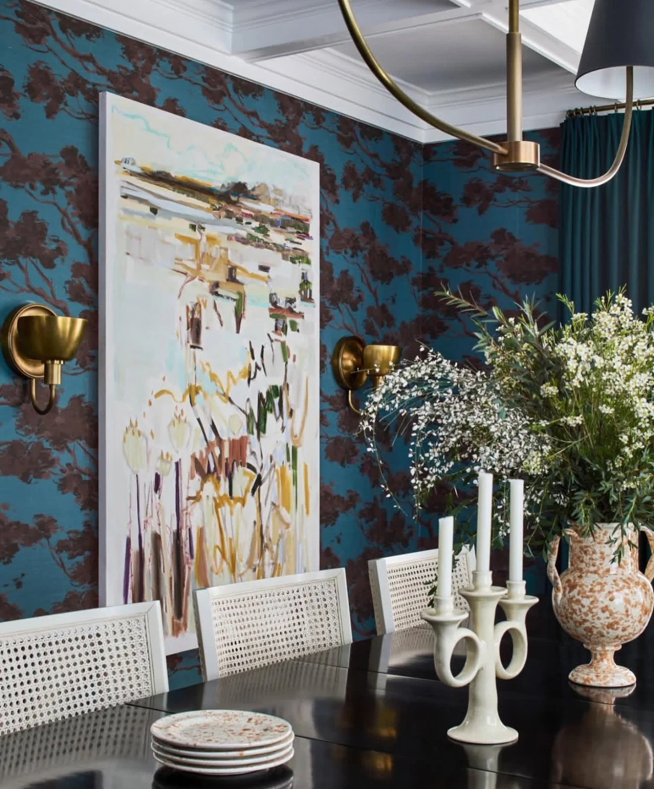 A dining room with a dark wood table, white chairs, a floral arrangement in a vase, three white candles in a ceramic candlestick, a large abstract painting on a patterned blue and brown wallpaper wall, gold wall sconces, gold and black pendant lighting, with blue curtains.
